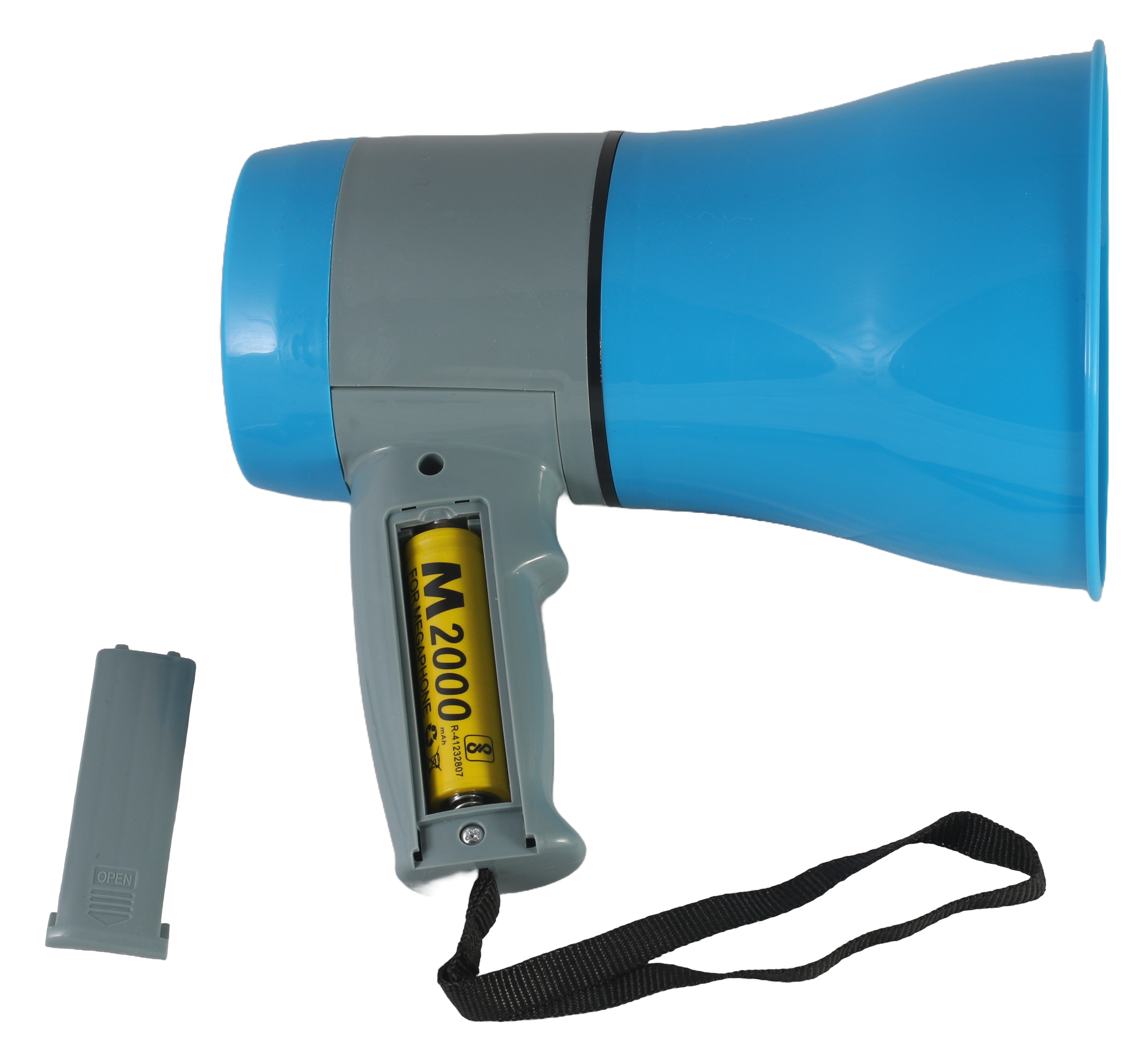 Компактный ручной электромегафон мощностью 20Вт, с записью 260 секунд, mp3 плеером, сиреной, питанием от аккумулятора.